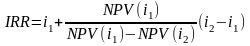 где i1 — значение коэффициента дисконтирования, при котором NPV(i1) больше 0, i2 - значение коэффициента дисконтирования, при котором NPV(i2) меньше 0.