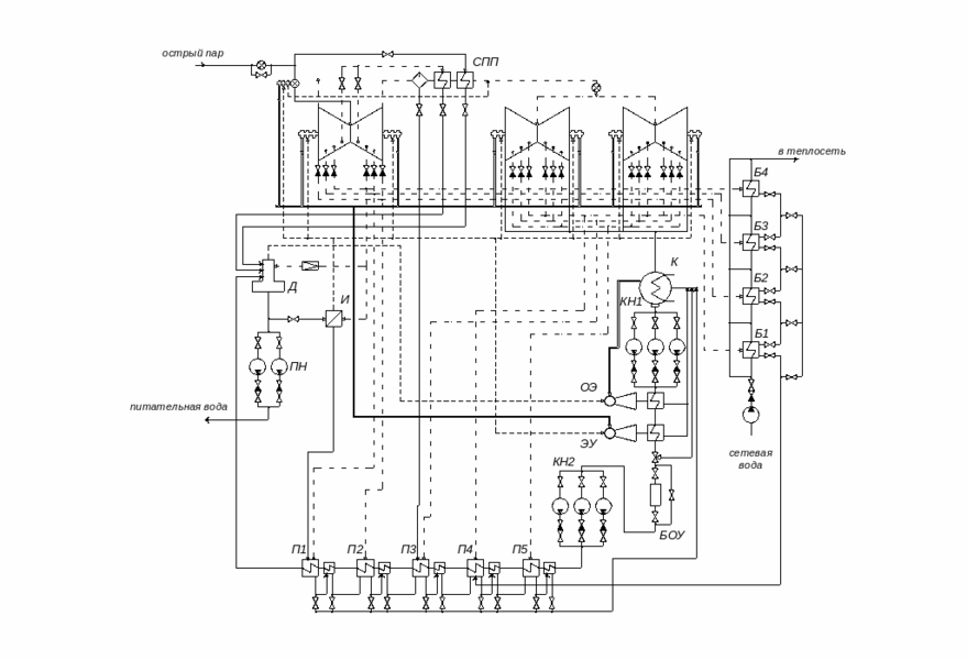 Турбина К-500-65/3000 состоит из одного двухпоточного ЦВД и четырех двухпоточных ЦНД. Отборы из ЦВД и ЦНД идут на регенеративные подогреватели, а также на подогреватели сетевой воды, деаэратор и испаритель. Для уменьшения поступления продуктов коррозии в реакторную воду, ПВД не устанавливаются. Охладители дренажей установлены после каждого ПНД (в данной схеме пять ПНД). Используем каскадного слива дренажей ПНД, которые сливаются в конденсатор. Конденсатный насос установлен по двухподъемной схеме: КН1 – после конденсатора, а КН2 – перед ПНД1.