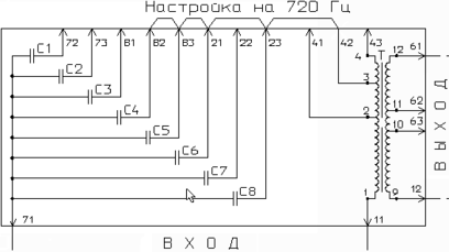 В фильтре ФПМ 8, 9, 11 на частоте 420 Гц используется вся индуктивность трансформатора (вывод 43 блока). На частотах 480 и 580 Гц она уменьшается примерно пропорционально частоте (выводы 42 и 41 соответственно). В фильтрах ФПМ 11, 14, 15 выводы 43, 42 и 41 используются соответственно на частотах 580, 720, и 780 Гц.