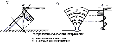 В многослойном угловом или стыковом шве (рис. Б) каждый последующий слой при своем остывании сжимает предыдущий, отчего усадочные напряжения резко снижаются.