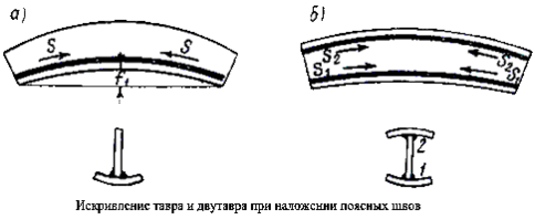 При двустороннем одновременном наложении продольных швов двутаврового сечения получается симметричная эпюра, не дающая искривлений по продольной оси элемента. При последовательном наложении второй валик только в некоторой степени уменьшает искривления, полученные в результате наложения первого валика (рис. Б).
