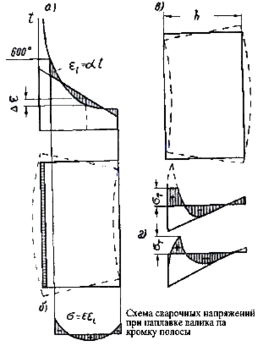 При сварке двух полос в тавр эпюра продольных напряжений получается по аналогии с наплавкой валика на кромку. Эти продольные напряжения вызывают коробление детали (рис. А).