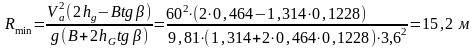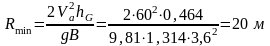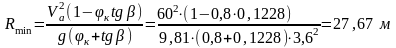 Если движение происходит на горизонтальной дороге, то β=0, тогда минимальный радиус поворота находится: