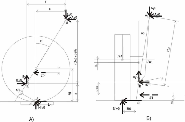 Действующую в пятне катящегося колеса силу тяги LA1, следует вначале перенести в центр колеса, обозначив ее L′A1, а затем как L′′A1 перенести ее на ось поворота под прямым углом к последней. Это необходимо для расчета составляющих сил в направлении оси Z в точках А и В. Таким образом, сила тяги обозначаемая LA1, оказывается смещенной от центра колеса вниз на величину аL (рис. 5.1.).