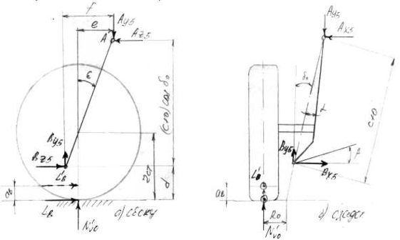 В этом случае не будем пренебрегать изменением угла α между осью поворота и осью амортизатора, как это было сделано в случае максимальной вертикальной нагрузки (случай 2 п.5.3.4) из-за ничтожного его изменения в сравнении с изменением угла δo → δ2. Так как очень сложно учесть все факторы, влияющие на изменение развала γ, то единственными критериями оценки изменения угла α можно считать кратчайшее расстояние от центра шаровой опоры до оси амортизатора и угол δo – α = 8° между осью колеса и осью амортизатора, которые неизменны при любом положении подвески.