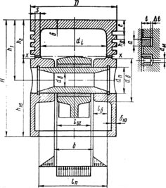 Расстояние b между торцами бобышек зависит от способа крепления поршневого пальца и обычно принимается на 2-3 мм больше длины верхней головки шатуна lш. Конкретные значения конструктивных элементов поршня принимаются по прототипам с учетом соотношений, приведены в табл. 6.1.
