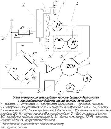 Частота вращения двигателей постоянного тока 3, 8, вращающих, соответственно, вентилятор 2 и водяной насос 9, зависит от текущих значений температуры ОЖ.