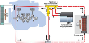 Фирма «Эберспехер» известна своими автономными подогревателями, обеспечивающими прогрев салона и двигателя без пуска последнего. Союз «и», однако, уместно заменить на «или», если у автомобиля мотор солидного рабочего объема. Дело в том, что его массивный блок цилиндров «работает» как алюминиевый радиатор, расточая драгоценное тепло в окружающее пространство. Процесс затягивается – а водителю-то хочется, чтобы стекла скорее оттаяли, и можно было сразу снять верхнюю одежду. До сих пор противоречие решали с помощью специального клапана, позволявшего подогревателю гонять антифриз по малому кругу, не расходуя киловатты на прогрев мотора. Решение не самое оптимальное, поскольку, во-первых, холодный пуск приводит к повышенному выбросу вредных газов, а, во-вторых, сразу после пуска этот клапан автоматически подключал большой круг «тосолообращения», отчего из дефлекторов начинало веять холодом.