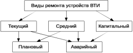 На схеме, приведенной на рис.1.7. показаны виды ТО, на схеме (рис.3.8.) – виды ремонта, а на схеме (рис.3.9.) – методы ТО и ремонта, предусмотренные ГОСТ 28470 - 90[3.3] и ГОСТ 26553 - 85[3.4] для устройств ВТИ.