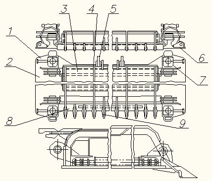 1 – лист – основание; 2 – уголковые направляющие ленты; 3 – задний лист; 4 – дуга; 5 – крюк; 6 – проушина; 7 – гнездо; 8 – режущая кромка; 9 - зуб