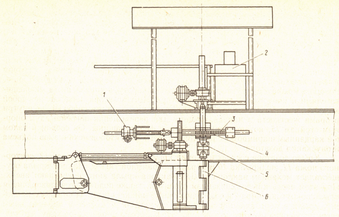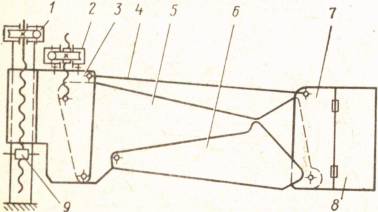 Крыло поворачивают механизмом 1 (рисунок 2 ) поворота, винт которого соединяется шарнирно с рейкой 3, сцепленной с шестерней 4. Последняя посажена на вал поворота крыла и связана с ним скользящей шпонкой. В зави-симости от направления вращения электродвигателя винт перемещается влево или вправо. Перемещение винта и связанной с ним рейки 3 вызывает поворот шестерни 4, а следовательно, и вала механизма поворота. Поворот вала передается на крыло карданным валом 5 и валом петлевого шарнира 6, с которым крыло связано срезными штифтами и сегментными упорами. Такое соединение крыла с валом петлевого шарнира предохраняет самотормозящийся механизм поворота крыла от поломок при обрыве стяжек крыла или в других случаях перегрузки. Дозатором управляют с поста 2. Дозатор поднимают и опускают два механизма 4 (см. рисунок 2). При этом щит дозатора перемещается по опорным стойкам 15. Ход щитов дозаторов: фермы № 1 выше головки рельса 300 мм, ниже головки рельса 100 мм; фермы № 2 выше головки рельса 250 мм, ниже головки рельса 100 мм.