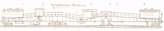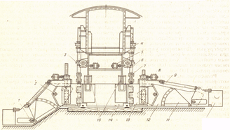 Электромагнитный подъемник 13, балластерные рамы 12, механизмы сдвига пути 11 и подъема пути 4. У электромагнитного подъемника имеются р ельсовые захваты 10, предназначенные для страховочного удержания поднятой путевой решетки при зарядке струнок и подъемке мостов. Перед тележкой № 1 установлены шпальные и рельсовые щетки 8. В хозяйственной будке 6 размещается бригада во время транспортирования машины и хранится инструмент для обслуживания механизмов электробалластера и ухода за ними. На центральном посту управления 3 находятся приборы и аппараты для управления электромагнитным подъемником и балластерными рамами. На ферме № 2 расположены кронштейн междуферменного шарнира 14, дозатор двустороннего действия 16, машинное отделение 1 и пост 2 управления дозатором. Вдоль обеих ферм установлены перила 5.
