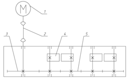 1 – двигатель; 2 – карданный вал; 3 – ускоряющее зубчатое колесо; 4 – дебаланс; 5 – синхронизирующие зубчатые шестерни.