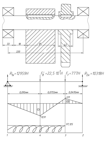 В этом разделе исходными данными являются: силы, действующие на колесо шестерни, расстояния между линиями действия всех сил, диаметры колёс.