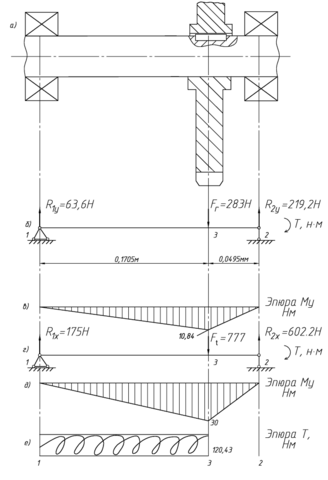 На вал действуют две силы в двух плоскостях: Fr в плоскости y0z и Ft в плоскости x0z и действует крутящий момент T (рисунок 2.11, а, г).