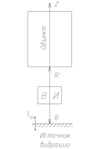 При постановке задачи в исследуемую механическую систему выделили две подсистемы: источник возмущений и объект защиты, соединённые между собой связям. Силы, возникающие в связях R и R’, вызывающие колебание объекта, называются динамическими (рисунок 5.2).