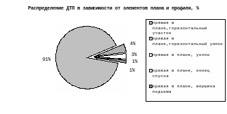 Согласно статистике, приведенной в Таблице 10 большая часть ДТП (91% случаев) происходят на прямых горизонтальных участках дороги, что подтверждает общепризнанную международную тенденцию: прямые участки дороги провоцируют водителей на движение с высокими скоростями, следствием чего является увеличение риска ДТП с тяжелыми последствиями.