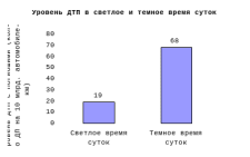 Согласно Диаграмме 15 риск ДТП в темное время суток выше в 3.5 раза, чем в светлое время. Более высокий риск ДТП в темное время суток - общепризнанный факт с учетом пересчета количества ДТП на интенсивности движения, которая ниже дневной в несколько раз. Кроме этого, все страны с продолжительным стажем автомобилизации имеют в своем законодательстве требование по обязательному использованию ближнего света в дневное время. Имеющаяся статистика ДТП на северодвинской дороге показывает более высокий риск ДТП в светлое время суток. Учитывая различие требований и методов статистического учета, невозможно провести простое сравнение российских и зарубежных показателей. Можно утверждать лишь следующее: существует потенциал сокращение количества ДТП в светлое время с помощью проверенного способа - использования ближнего света фар.