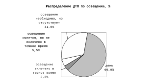 Данные Таблицы 13 и Диаграммы 16 свидетельствуют, что 60% ДТП произошло днем при естественном освещении. Отсутствие искусственного освещения в темное время суток на участках, где это необходимо сопутствовало 31% ДТП. Еще 5.5% учетных ДТП произошли в темное время суток, когда существующее искусственное освещение имелось, но не было включено. В сумме в темное время суток за рассматриваемый период произошло 36.5% ДТП, что соответствует существующим мировым тенденциям (30-40% ДТП).