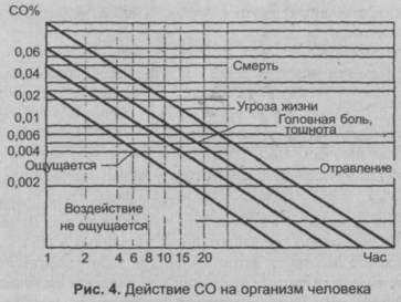Дымность ОГ не должна превышать норм, указанных в таблице 6.2. Проверка дымности автомобилей при работе двигателя на максимальной частоте вращения олостого хода является частично диагностической. При повышенной дымности на этом режиме могут быть выявлены дополнительные неисправности автомобиля, плохо работающие форсунки, повышенный уровень масла и другие, которые при движении автомобиля под нагрузкой будут давать повышенную дымность ОГ. Необходимо отметить тот факт, что в настоящее время отсутствует должный контроль за качеством используемых ГСМ при поставках, хранении, заправке, эксплуатации и утилизации, что, конечно же, сказывается на токсичности ОГ двигателей ТС. Один из самых токсичных компонентов ОГ - оксид углерода. Поэтому наибольшей опасности отравления СО подвергаются люди, находящиеся в закрытых, плохо вентилируемых помещениях рядом с работающим двигателем. В этом случае концентрации СО в воздухе могут достигать опасных значений (0,01-0,05%). Особенно опасно находиться в кабине автомобиля с негерметичной системой выпуска ОГ. Не рекомендуется также длительное пребывание в кабине автомобиля, двигатель которого постоянно работает на х.х. В этом случае, даже при полностью исправной системе выпуска, из-за скопления ОГ вокруг автомобиля, возможно повышение концентрации СО в кабине до значений, вызывающих потерю сознания, рисунок 6.1.