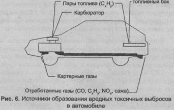 Рисунок 6.3 - Источники образования вредных токсичных выбросов в автомобиле