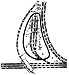 Як приклад можна принести учбово-тренувальний, полігон відбудовного поїзда станції Дарниця Південно-Західної залізниці, план якого наведений на рис. 1.2. Полігон має шляховий розвиток із трьох шляхів. Шлях І, на якій покладені залізобетонні шпали, призначений для випробування вантажопідйомних кранів, має довжину 200 м і площадку 3 (45x40 м) із щебеневим покриттям. Усередині споруджена площадка 2 менший розміри (23x15 м) з бетонним покриттям, на якій установлюються вантажопідйомні крани для їх статичного й динамічного випробування. На основній площадці розмішений побір каліброваних блоків масою від 2,5 до 80 т (загальна маса 320 т). Шлях ІІ довжиною 250 м з тупиком, виконаним у вигляді торцевої рампи, і ділянкою контактної мережі призначений для стоянки відбудовного поїзда й спуска тягачів, тракторів, бульдозерів. Шлях ІІІ призначений для стоянки списаного рухливого складу. Він складається із чотирьох ділянок з рейками типу Р50 і Р65 на дерев'яних і залізобетонних шпалах, а також з ділянки з контактною мережею. По периметрі навчального полігона влаштована закільцована ґрунтова дорога 6*, призначена для обкатки й роботи тягових засобів, із пристроєм переїзду 4 у горловині шляху полігона. У горловині шляху побудована переїзна будка 7, до якої підключена електроенергія для опалення электротенами. Будка телефонізована, має зовнішній звуковий і світловий повторювач.