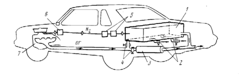 1-каталитический дожигатель; 2-ресивер; 3-электроклапан; 4-криогенный бак с жидким водородом; 5-заправочный трубопровод; 6-гидридный аккумулятор;7-регулятор.