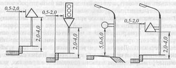 Для установки знаков в качестве несущих элементов используют специальные стойки, выполненные из стали, железобетона или дерева. Деревянные стойки применяют на автомобильных дорогах низших категорий. При размещении знаков над проезжей частью их монтируют на рамных (арочных) опорах или консолях. В городах широко применяют подвеску знаков на тросовых растяжках или их крепление на кронштейнах к стенам зданий и мачтам освещения. Необходимая длина опоры (рис. 2.2) при различных схемах установки дорожных знаков: