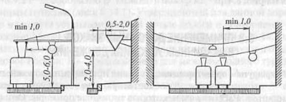 а, б - на специальных стойках; в, г, д -на мачтах освещения, е –на стене здания, ж – на тросах-растяжках.