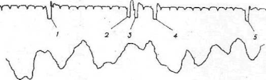 Изменения величины КГР чаще всего вызываются дополнительной информацией, например появлением встречного автомобиля, человека, переходящего дорогу (на записи КГР это отражается появлением новой волны) (рис. 1.5). Каждому объекту, имеющему отношение к режиму движения, соответствует появление волны, означающей, что водитель воспринял и переработал информацию, заключенную в каждом объекте.