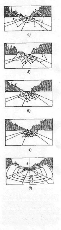 Рис. 1.4 Положение точек фиксации взгляда водитляя при движении с различной скоростью: а) 20 км/ч; б) 40 км/ч; в) 60 км/ч; г) 80 км/ч; д) зоны концентрации внимания водителей