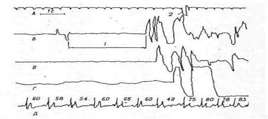 ис.1.6. Запись психофизиологических показателей водителя в момент потери бдительности: 1 - дремотное состояние; 2 - момент пробуждения. А - запись пути и времени; Б - перемещение взгляда водителя в горизонтальной плоскости; В - перемещение взгляда водителя в вертикальной плоскости; Г - запись кожно-гальванической реакции; Д- частота пульса