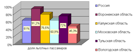 Рис. 2.5 показывает, что наибольший удельный вес по количеству льготников занимает по России Воронежская область. Что касается Иркутской области, то по официальным данным Росстата она занимает 10-е место среди всех регионов России. Столь высокая доля пассажиров, пользующихся льготным проездом принуждает государство наиболее жестко регулировать рынок пассажирских перевозок. Со своей стороны государство постоянно регулирует этот ранок, защищая права льготников.