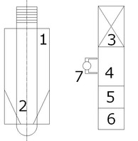 1 – автомобиль, 2 – смотровая яма, 3 – шкаф для инструментов, 4 – рабочий стол, 5 – урна для утилизации отходов, 6 – мойка, 7 – исполнитель.