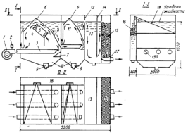 1 — насосная установка; 2 — эжектор для подачи воздуха в распределительный трубопровод; 3 — распределительный трубопровод; 4 — первая флотационная камера; 5 — блок тонкослойного отстаивания; 6 — маслонакопитель; 7 — отражатель; 8 — наклонная перегородка; 9 — водоэжектор; 10 — шламонакопитель; 11 — вторая флотационная камера; 12 — вертикальная перегородка; 13 — отстойная камера; 14 — вертикальная перегородка; 15 — фильтр тонкой очистки; 16 — маслосборник; 17 — выводной трубопровод; 18 — перелом наклонной перегородки.