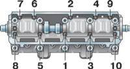 Предварительно затягиваем гайки в последовательности, указанной на рисунке, до прилегания поверхностей корпусов подшипников к головке цилиндров. При этом необходимо следить за тем, чтобы установленные втулки корпусов свободно вошли в свои гнезда.
