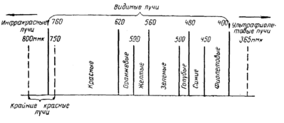 Промені визначеної зони спектра - це види променистої енергії, що розрізняються між собою по частоті електромагнітних чи коливань довжині хвилі відповідно на невидимі інфрачервоні промені, крайні червоні промені, промені видимого світла (червоні, жовті, зелені і т.д.) і невидимі ультрафіолетові промені - див. схему, мал. 2.
