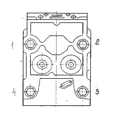 Рис.1.5. Величина момента затяжки болтов 40-50Н.м (4-5 кгс.м) (Головка сменная 19 мм, ключ с присоединительным квадратом, рукоятка динамометрическая модель 131М, графитовая смазка (УСсА)3333-80, кисть) 50. Повторить работы 47-49 для каждого цилиндра блока цилиндров. 51.Затянуть окончательно болты крепления головок цилиндров в два приёма. Величина момента затяжки болтов крепления для приёма 120-150 Н.м (12-15кгс.м);для приёма 160-180 Н.м (16-18 кгс.м) (Головка сменная 19 мм, ключ динамометрический модель ПИМ-1754) 52.Повернуть коленчатый вал так, чтобы шток фиксатора маховика вошёл в паз маховика, а метка «0» шестерни распределительного вала находилась в верхнем положении. (рычаг) 53.Установить ведомую шестерню привода ТНВД в сборе с валом на двигатель. Ведомую шестерню установить так, чтобы метка «0» ведомой шестерни совпала с аналогичной меткой шестерни распределительного вала. 54.Установить прокладку, корпусов заднего подшипника в сборе с манжетой и завернуть болты крепления с пружинными шайбами. Величина момента затяжки болтов 45-50 Н.м (4,5-5,0 кгс.м) (Головка сменная 17мм, ключ с присоединительным квадратом , рукоятка динамометрическая модель 131М, молоток) 55.Вывести фиксатор из паза маховика и повернуть коленчатый вал на 60 градусов по ходу вращения, установив его тем самым в положение согласно таблице 1.4. Поворот маховика на угловое расстояние между двумя соседними отверстиями на выступах, соответствует повороту коленчатого вала на 30 градусов. Таблица 1.4. Регулировка клапанов