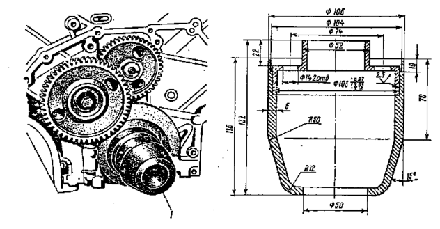 | 31.Обозначение вкладышей соответствующей шейки, диаметр постели в шатуне нанесены на тыльной стороне вкладыша (головка сменная 19мм, ключ с присоединительным квадратом) 32. Смазать вкладыши шатунных подшипников и установить их в крышки шатунов и в нижние головки шатунов. Смазать маслом М10Г2К. Выступы на вкладышах должны совпадать с выточками на крышке и шатуне (ёмкость с маслом, кисть) 33.Повернуть коленвал для установки первой шатунной шейки в нижнее положение (рычаг). 34.Развести замки поршневых колец поршня с шатуном и кольцами в сборе первого цилиндра на 180 градусов относительно друг друга и установить поршень с шатуном и кольцами в сборе в соответствующий цилиндр с помощью оправки. Индекс поршня должен быть одинаковым с индексом гильзы. Поршни с индексом 10, можно устанавливать в любые гильзы. При установке поршней, вытачки под клапаны на днище поршня сместить в сторону развала блока цилиндров. (отправка для установки поршня, деревянный молоток) 35.Установить крышку шатуна на соответствующий шатун и предварительно закрепить болтами с гайками. С величиной момента затяжки 29-31 Н.м.( 2,9-3,1 кгс.м.) Клейма спаренности из цифр на шатуне и его крышке должны быть одинаковыми. Канавка на шатуне должна совпадать при установке с замковым усом на крышке шатуна (головка сменная 19мм., ключ с присоединительным квадратом, удлинитель, рукоятка динамометрическая модель 131М). 36.Повторить работы 33, 34 для последовательной установке поршней с шатунами и кольцами в сборе в 8,2,7,3,4,5 и 6 цилиндры. 36.Повернуть коленчатый вал так, чтобы первая шатунная шейка оказалась в нижнем положении. Отчёт нумерации вести от передней части блока цилиндра. 37. Произвести окочательную затяжку гаек шатунных болтов первой шатунной шейки. Затяжку гаек производить до удлинения шатунных болтов 0,25-0,27 мм. Гайки шатунных болтов М13Х 1,25 изготавливаемые с 1 июля 1985 года, затягиваются с величиной момента затяжки 120-130 Н.м.(12-13 кгс.м.) (головка сменная 19 мм, ключ с присоединительным квадратом, приспособление для контроля удлинения, рукоятка динамометрическая 131М) 38.Проверить зазор между торцами нижней головки шатуна и щеками коленчатого вала, зазор должен быть не менее 0,15 мм (набор щупов №2) 39.Повернуть блок цилиндров в горизонтальное положение. ( стенд) 40. Смазать прокладку картера маховика, установить прокладку, с помощью оправки картера маховика на блок цилиндров, Рис.1.3. Оправка манжеты для установки картера маховика Рис.1.3. совместить отверстия в картере, прокладке и блоке, установить болты и крепления с пружинами и плоскими шайбами и завернуть их, применять смазку ЦИАТИМ-201. Величина момента затяжки болтов крепления картера маховика 90-110 Н.м (9-11 кгс.м)(ёмкость, кисть, отправка, головка сменная 17 мм и 19мм, ключ с присоединительным квадратом, рукоятка динамометрическая модель 131М) 41.Установить на двигатель маховик в сборе и совместить отверстия под болты крепления маховика. Маховик устанавливать таким образом, чтобы установочный штифт на коленчатом валу вошёл в отверстие в маховике. (кран-балка, подвеска для установки маховика.) 42.Установить и завернуть болты крепления с замковыми креплениями маховика и загнуть края пластин на грани болтов. Величина момента затяжки болтов крепления 150-170Н.м ( 15-17 кгс.м) Замковые пластины устанавливались на двигателях до №75800 выпуска до февраля 1979 года. (голов
