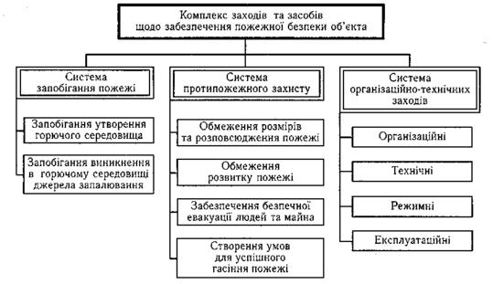 Основними системами комплексу заходів та засобів щодо забезпечення пожежної безпеки об'єкта є: система запобігання пожежі, система протипожежного захисту та система організаційно-технічних заходів. Оскільки дві перші системи достатньо об'ємні та потребують більш детального вивчення, то розглянемо їх окремими пунктами розділу.