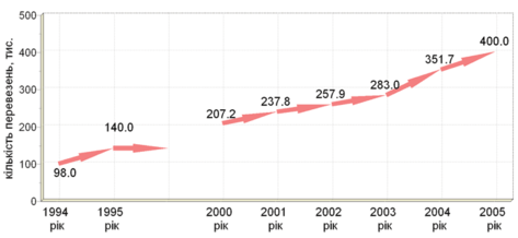 Рис. Динаміка міжнародних перевезень вантажів автомобільним транспортом у 1994-2005 рр.