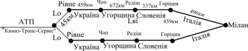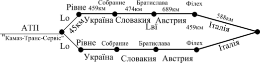 Маршрут – зазделегіть розроблений найбільш раціональний шлях слідування при виконанні перевезень. Розробивши дві схеми маршруту з міста Рівне (Україна) в місто Мілан (Італія), нам потрібно вибрати найкращий.