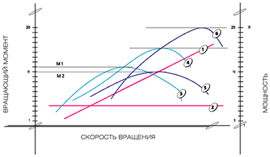 Мощность есть произведение вращающего момента на скорость вращения коленчатого вала (обороты), так, что мощность – зависимая от скорости величина. Рассмотрим чисто теоретический двигатель (не важно, электрический он, внутреннего сгорания или турбореактивный), который отдает постоянный вращающий момент на оборотах от 0 до бесконечности (кривая 2 на рис.). Тогда его мощность будет линейно расти с оборотами от 0 до бесконечности (кривая 1 на рис.). Предмет нашего интереса – четырехтактные многоцилиндровые двигатели внутреннего сгорания в силу конструкции и процессов, в них происходящих, имеют рост момента с увеличением оборотов до его максимальной величины, и с дальнейшим увеличением оборотов момент снова падает (кривая 3 на рис. 1). Тогда и мощность будет иметь аналогичный вид (кривая 4 на рис. 1). Важным обстоятельством для понимания функций выпускной системы является связь вращающего момента с коэффициентом наполнения цилиндра. Давайте себе представим процесс, происходящий в цилиндре в фазе впуска. Предположим, коленчатый вал двигателя вращается настолько медленно, что мы можем наблюдать движение топливовоздушной смеси в цилиндре и в любой момент времени давление во впускном трубопроводе и цилиндре успевает выравниваться. Предположим, что в верхней мертвой точке (ВМТ) давление в камере сгорания равно атмосферному. Тогда при движении поршня из ВМТ в нижнюю мертвую точку (НМТ) в цилиндр попадет количество свежей топливовоздушной смеси, точно равное объему цилиндра. Говорят, что в таком случае коэффициент наполнения равен единице. Предположим, что в вышеописанном процессе мы закроем впускной клапан в положении поршня, соответствующем 80% его хода. Тогда мы наполним цилиндр только на 80% его объема и масса заряда составит соответственно 80%. Коэффициент наполнения в таком случае будет 0.8. Другой случай. Пусть некоторым образом нам удалось во впускном коллекторе создать давление на 20% выше атмосферного. Тогда в фазе впуска мы сможем наполнить цилиндр на 120% по массе заряда, что будет соответствовать коэффициенту наполнения 1.2. Так, теперь самое главное. Вращающий момент двигателя совершенно точно на кривой момента соответствует коэффициенту наполнения цилиндра. То есть вращающий момент там выше, где коэффициент наполнения выше, и ровно во столько же раз, если, конечно, мы не учитываем внутренние потери в двигателе, которые растут со скоростью вращения. Из этого понятно, что кривую момента и, соответственно, кривую мощности определяет зависимость коэффициента наполнения от оборотов. У нас есть возможность влиять в некоторых пределах на зависимость коэффициента наполнения от скорости вращения двигателя с помощью изменения фаз газораспределения. В общем случае, не вдаваясь в подробности, можно сказать, что чем шире фазы и чем в более раннюю по отношению к коленчатому валу область мы их сдвигаем, тем на больших оборотах будет достигнут максимум вращающего момента. Абсолютное значение максимального момента при этом будет немного меньше, чем с более узкими фазами (кривая 5 на рис.). Существенное значение имеет так называемая фаза перекрытия. Дело в том, что при высокой скорости вращения определенное влияние оказывает инерция газов в двигателе. Для лучшего наполнения в конце фазы выпуска выпускной клапан надо закрывать несколько по