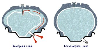 Главное достоинство бескамерной шины — длительное сохранение давления при проколе, а следовательно, — безопасность. Камерная шина при проколе теряет давление почти моментально, т. к. воздух быстро выходит через вентильное отверстие в ободе колеса. А из бескамерной шины воздух выходит только в месте прокола, и если дыра не слишком велика (от гвоздя, например), то давление теряется очень медленно.