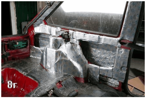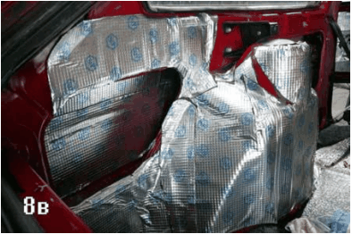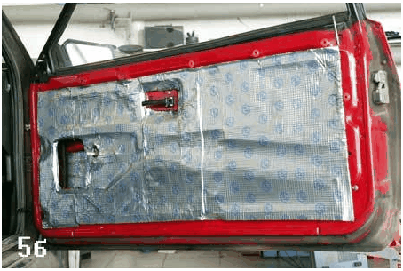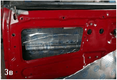 И третий этап – наклеивание шумовиброизоляции. Стараемся максимально обработать все выбранные поверхности. Начинаем с дверей. Сначала на метал клеится вибропоглощающий материал, который гасит колебания металла, а поверх него звукопоглощающий. В нашем случае будет использоваться только вибропоглощающий материал «вибропласт» так как он, не только гасит вибрации металла, но и очень хорошо глушит звук. Нарезаем кусками материал, с липкой стороны снимаем защитный слой и оклеиваем сначала внутреннюю полость (см. рисунок 7).