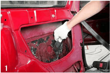 Первое – полностью разбираем салон автомобиля. То есть снимаем обшивки с дверей и крыши, накладки боковин и другие декоративные панели. Второе (при необходимости) – это демонтаж заводской виброизоляции. Для этого подойдет обычный шпатель и для облегчения процесса – строительный фен (см. рисунок 6).