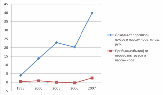 | Прибыль, убыток (-) от перевозок грузов и пассажиров - всего, млрд.руб. (1995 г. - трлн.руб.) | 0,4 | 0,9 | 0,09 | -0,3 | +2,5 |