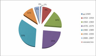 Как видно из рисунка 2.4, в 2007 году положение еще более ухудшилось. Доля судов, произведенных в 1980 – 1989 годах за анализируемый период не изменилась, а срок их эксплуатации возрос на 12 лет. Также очень незначительно изменилась доля судов, произведенных в 1970 – 1979 гг. До сих пор в наличии остаются суда, произведенные до 1949 г. Таким образом, налицо свидетельства того, что в отрасли наблюдается старение активного оборудования, а это является одним из наиболее существенных факторов повышения аварийности во внутреннем водном транспорте.
