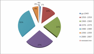 Как видно из приведенной диаграммы, наибольшая доля судов произведена в 1980 – 1989 году, т.е. срок их эксплуатации не превышал 15 лет. Однако при этом значительная доля судов была произведена в 1970 – 1979 и 1960 – 1969 годах, в сумме количество судов, срок эксплуатации которых превысил 20 лет составил более 50% всего действующего водного внутреннего транспорта, что говорит о крайней изношенности судов.