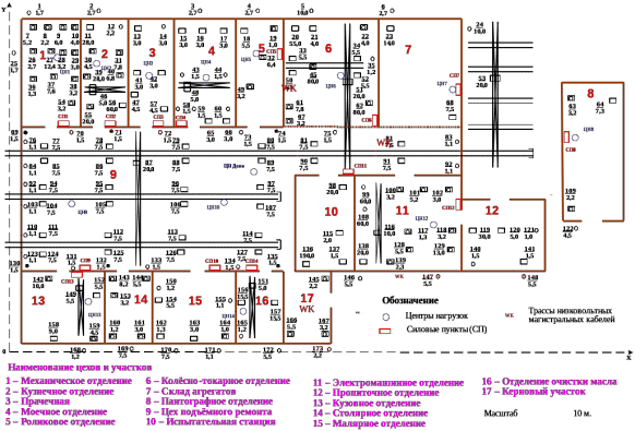В некоторых случаях возле определённого центра нагрузок оказывается движущееся оборудование, технологический проход и т.д. в таком случае силовой пункт необходимо располагать на ближайшем удобном участке площади депо. Для выбора места расположения силового шкафа питания группы нагрузок СП-11 выберем точку с координатами ХСП-11 = 73,0 м и YСП-11 = 37,0 м возле стены здания в помещении цеха подъёмного ремонта. Центр нагрузок оказывается удалён от силового пункта СП-11 на 1,0 м. Подобным образом определим координаты других групп ЭП и распределительных шкафов депо и данные занесём в таблицу 1.3.